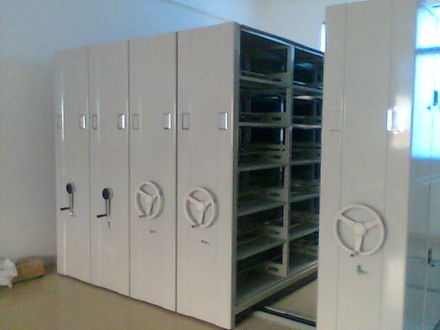 sistema de arquivamento de alta densidade É uma forma rentável de aumentar a capacidade de armazenamento e de utilizar um valioso espaço no chão, que pode dobrar a capacidade de armazenamento em comparação com as prateleiras estáticas convencionais.É amplamente utilizado em escritórios para armazenamento de arquivos e são projetados para ser facilmente re-localizado sem fixação do chãoO sistema se move ao longo de trilhos de piso, permitindo que o corredor seja deslocado para que as prateleiras necessárias possam ser acessadas, portanto, apenas um corredor é necessário.