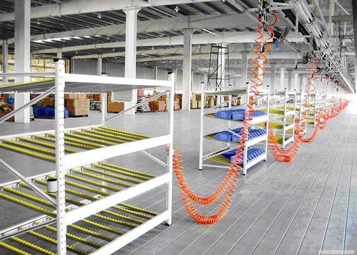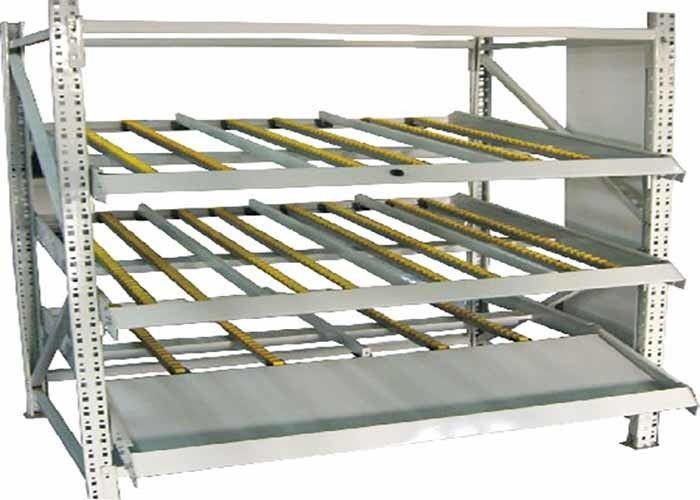 No que diz respeito ao rack de fluxo de paletes por gravidade, os paletes são colocados em rolos que inclinam para a face da picada por gravidade, sendo alcançado o "primeiro para dentro e primeiro para fora".e recuperado do lado oposto, eliminando o duplo manuseio da área de recepçãoA velocidade de produção combinada com a rotação automática do estoque é a principal vantagem deste sistema.